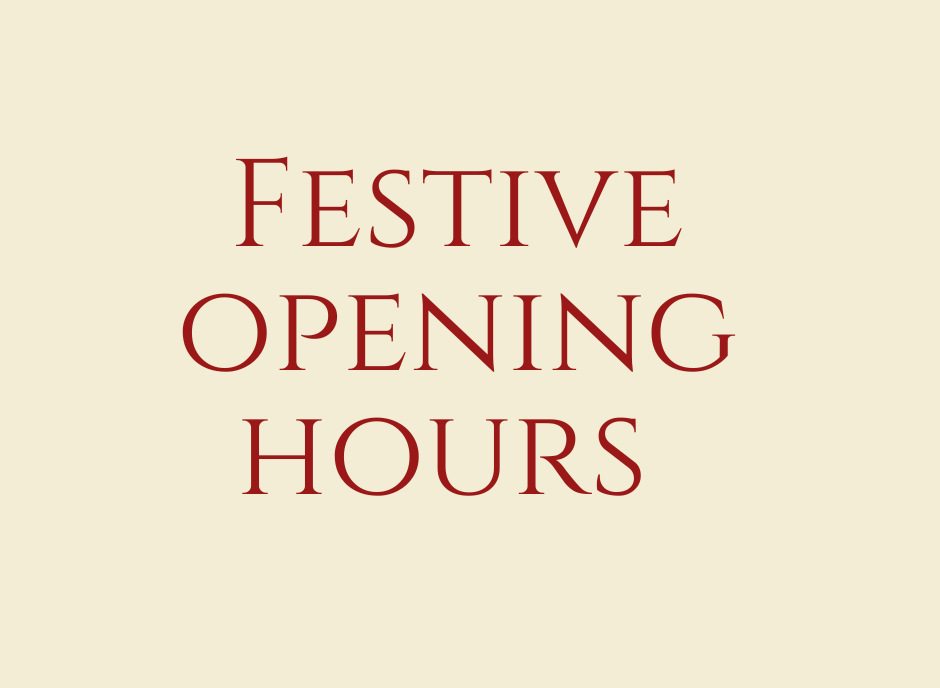 We're open Sunday 14th and Sunday 21st, 11am-4pm and Christmas Eve (Wednesday), 9am to 3.30pm. Note also that we're open till 6pm on Monday 22nd and Tuesday 23rd December 2025.
