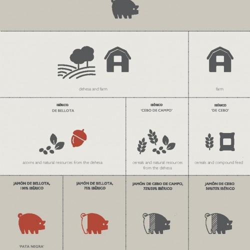 Ibérico ham (you might also hear it referred to as 'pata negra') comes from Iberian pigs that generally have dark or reddish skins, black hooves and are descended from the wild boars of the Iberian Peninsula. Location, butchering and salting are important but the breed and diet are the most significant factors when producing great Ibérico ham – the breed determines whether or not it is Iberico; the diet determines the grade. This diagram summarises it quite nicely.